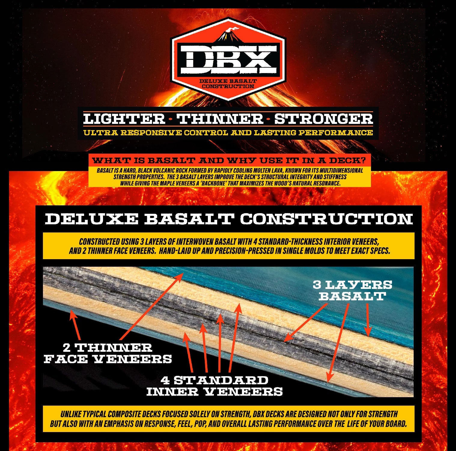 Skateboard deck from Anti Hero Skateboards featuring the all new DBX construction. These decks are lighter, thinner, and stronger than a typical skateboard deck. Made with 5 plys of maple plus 3 plys of basalt.