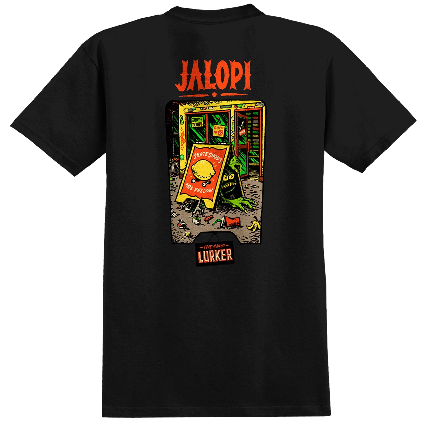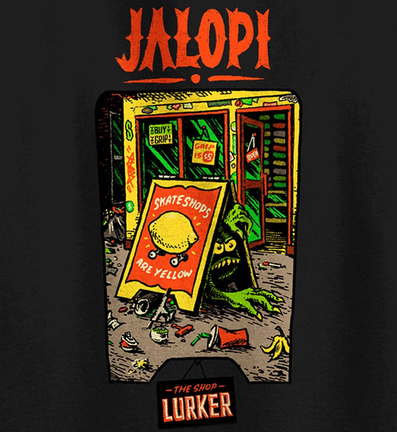 Celebrating Skateshop Day 2026 this rad graphic tee features the Jalopy "skateshops are yellow graphic". Small print on the front breast with a large back print.