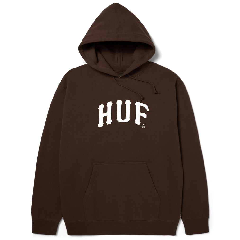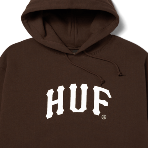 The iconic HUF Arch logo printed in white on a brown hoodie.