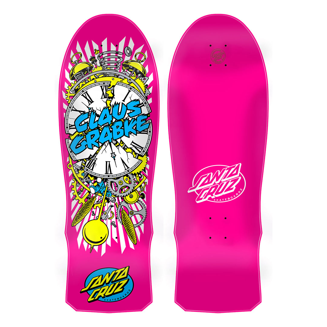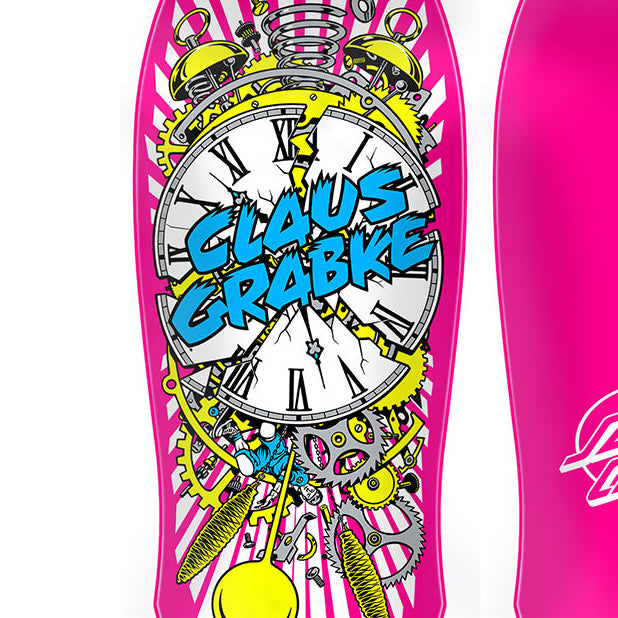 The Santa Cruz Skateboards Grabke Exploding Clock Reissue deck features Claus Grabke's classic 80's neon and metallic Exploding Clock artwork by Jim Phillips, on his OG 10" shape with 15.375 wheelbase, fully dipped in neon pink.