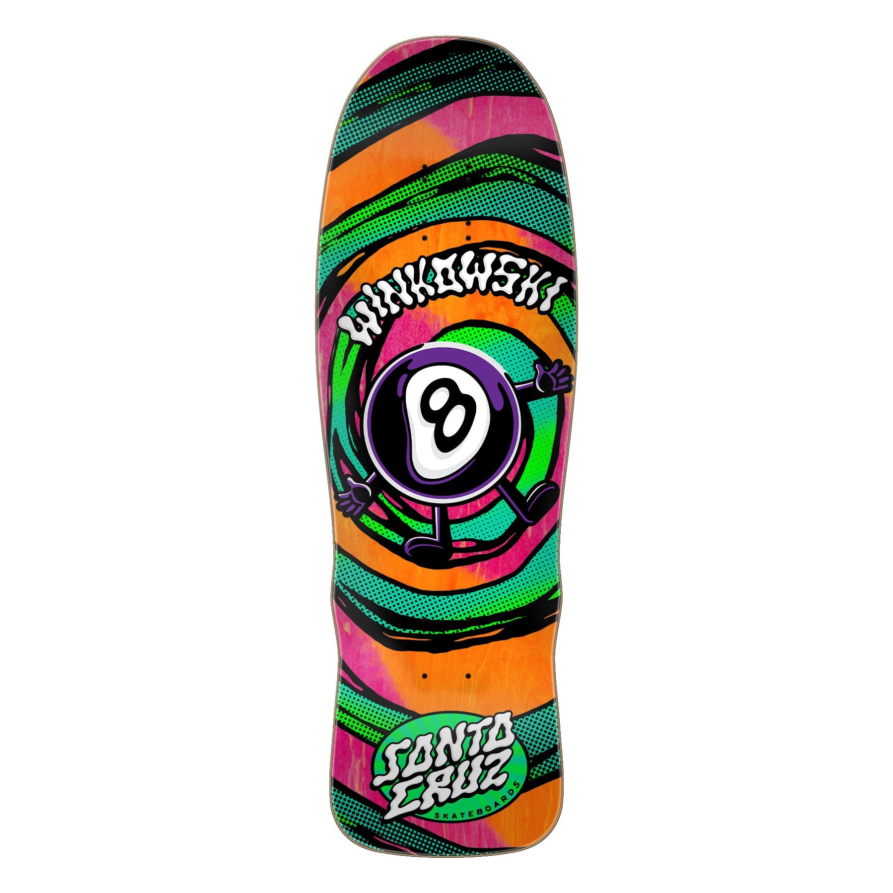 Santa Cruz Skateboards Erick Winkowski Vertigo MED Pro Shaped deck featuring a new medium version of Erick's newest shape for smaller skaters with adjustable 14-14.5" wheelbase, spot gloss and neon graphics with hand stained veneer and half tone fades.