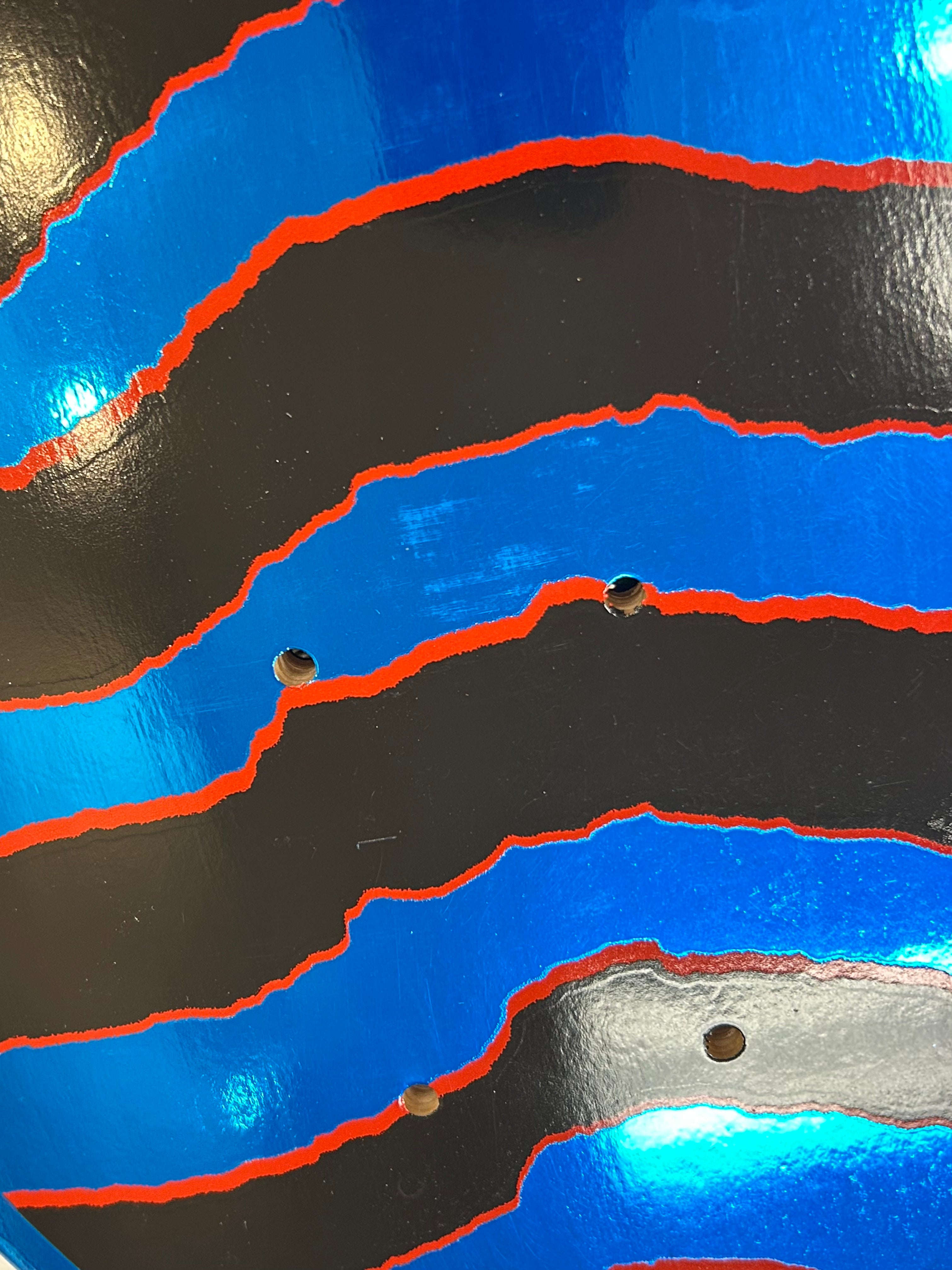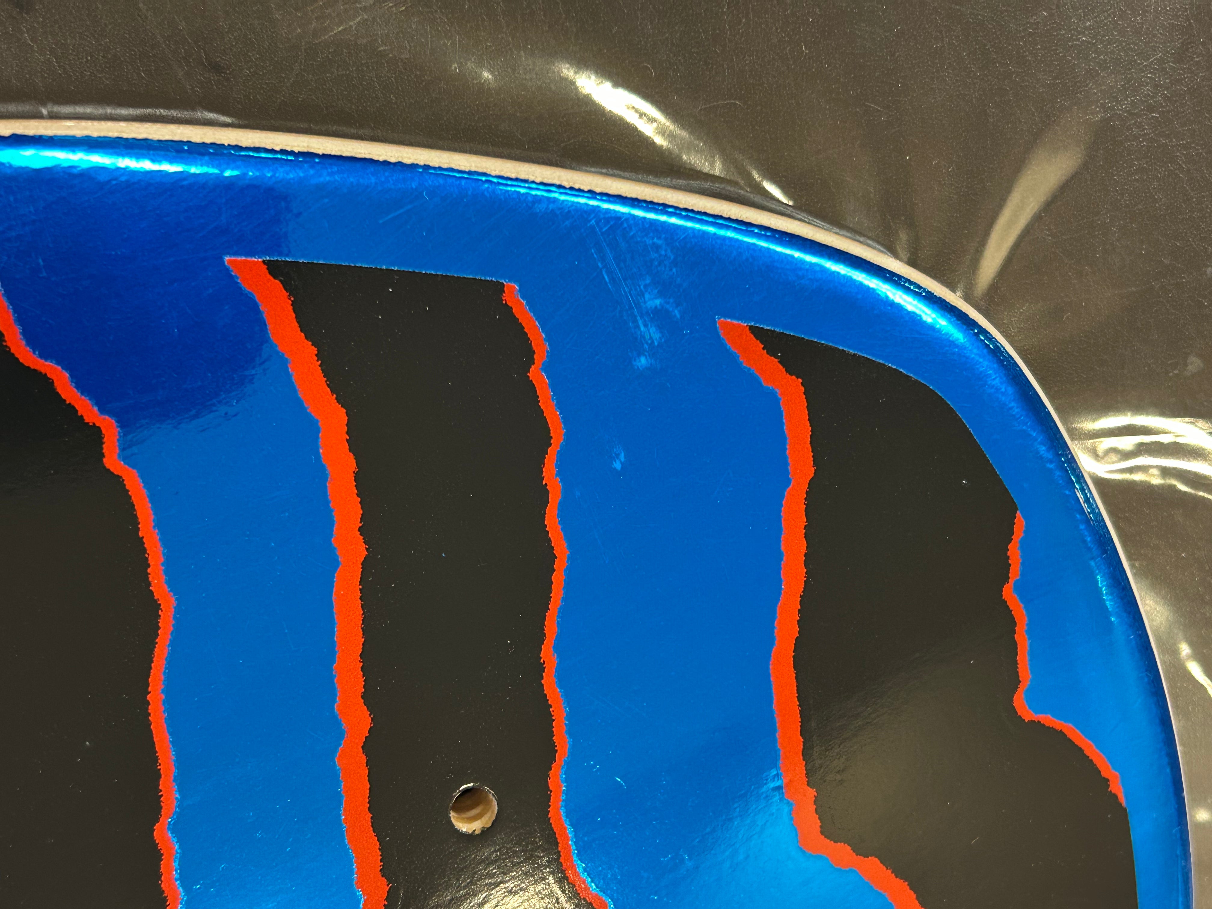 Powell Peralta's iconic Geegah Ripper skull in a blue chrome foil print with black and red.