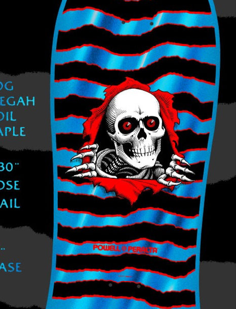 Powell Peralta's iconic Geegah Ripper skull in a blue chrome foil print with black and red.