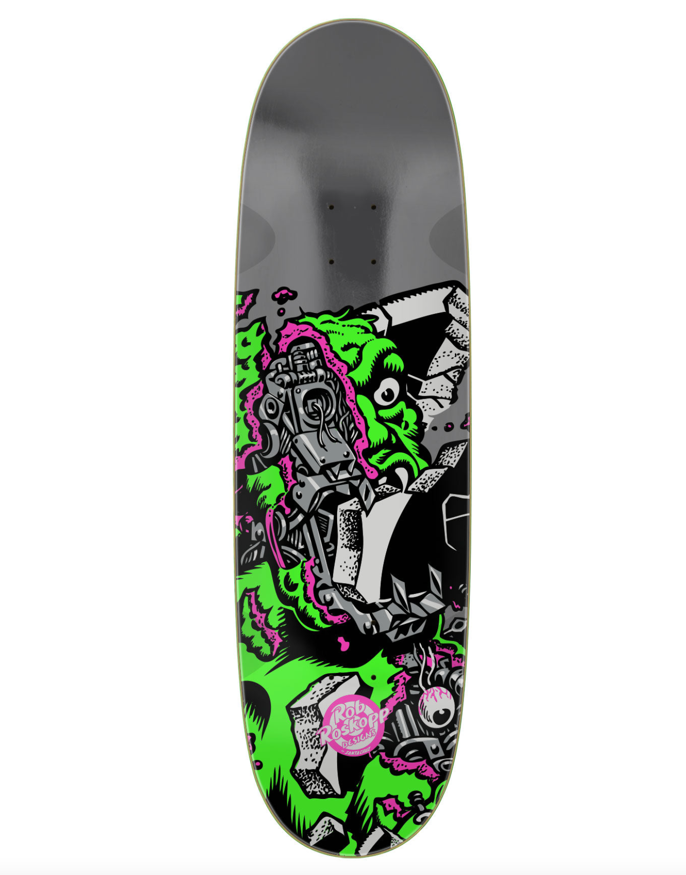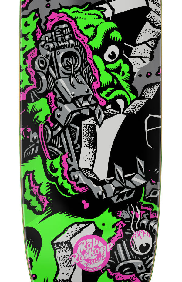 Santa Cruz Skateboards Rob Roskopp Macro VX Deck featuring spot gloss neon and metallic graphics with gunmetal foil on new custom shaped 9" egg with 4 wheel wells.