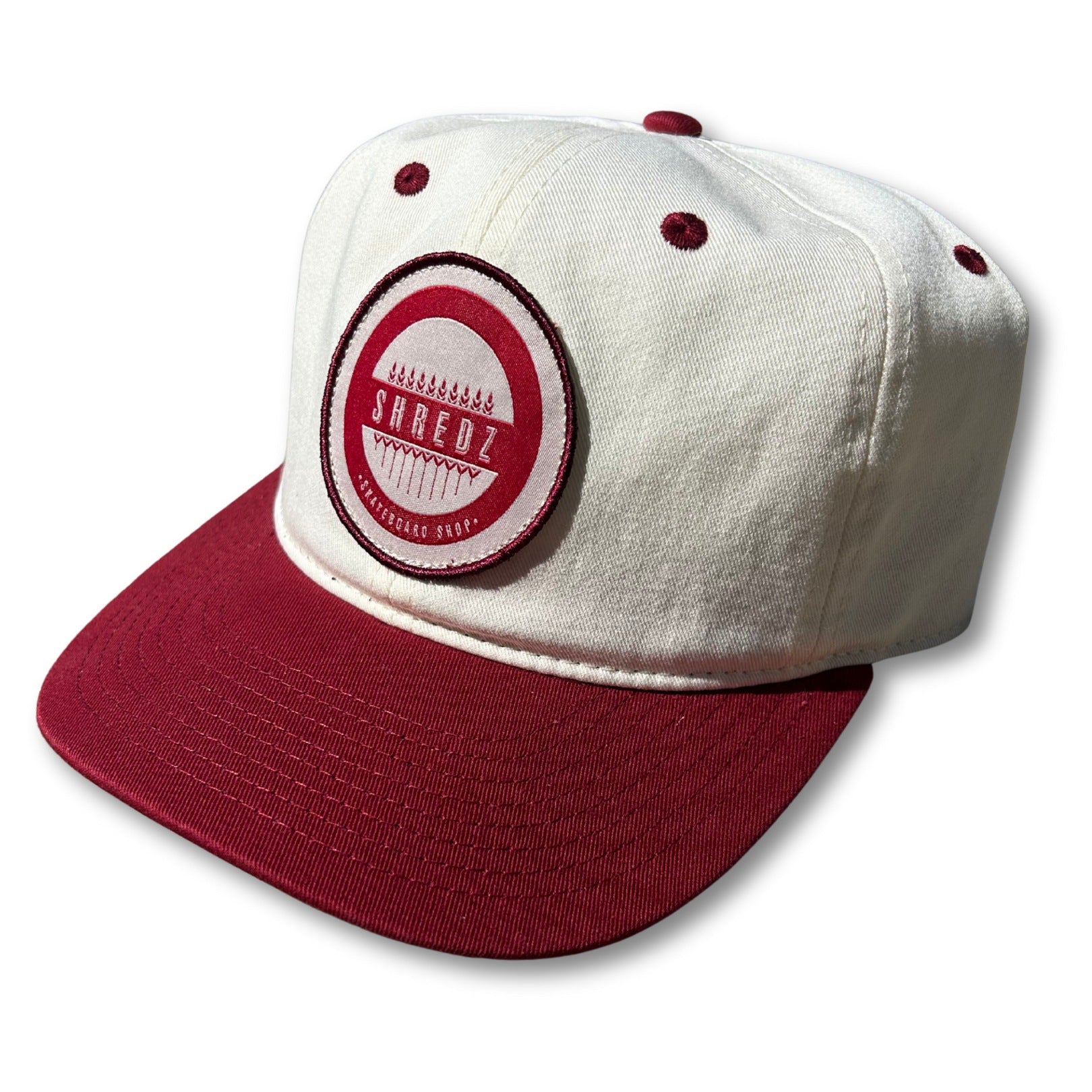 Unstructured five panel snap back hat featuring the Shredz "Shredded Wheat" Logo patch. Off white with forrest green brim, logo and eyelets. Snapback closure.