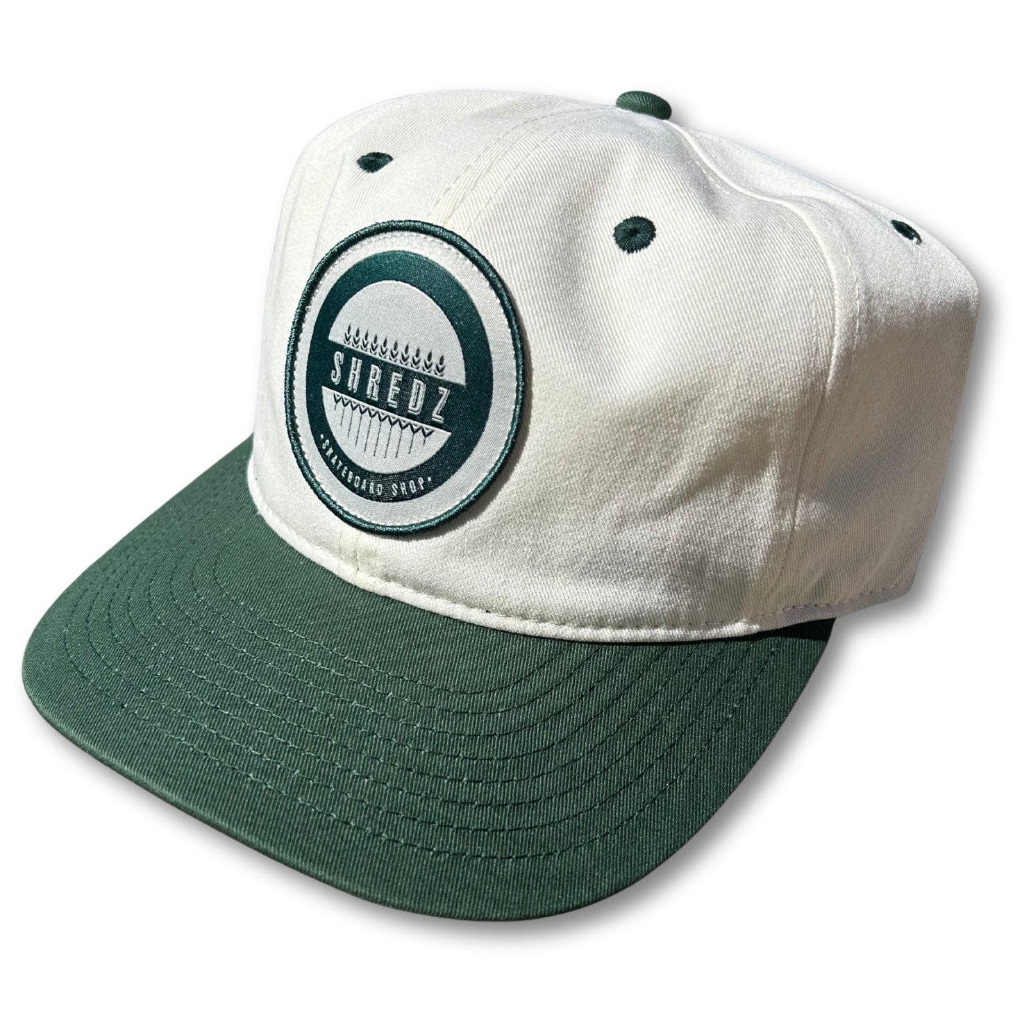 Unstructured five panel snap back hat featuring the Shredz "Shredded Wheat" Logo patch. Off white with forrest green brim, logo and eyelets. Snapback closure.