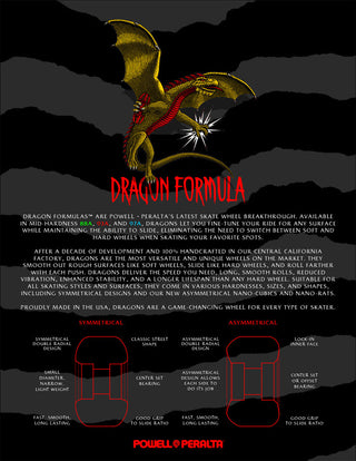 About Dragon Formula: The amazing new Dragon Formula™ (DF) Urethane used to create these wheels is another industry leading innovation from Powell • Peralta. DF-93A Dragons will not only roll over rough terrain, but also grip and slide like 99A and 101A wheels do, so that you can do all your normal tricks and more on the greater range of skate terrains made skateable by its softer 93A hardness.